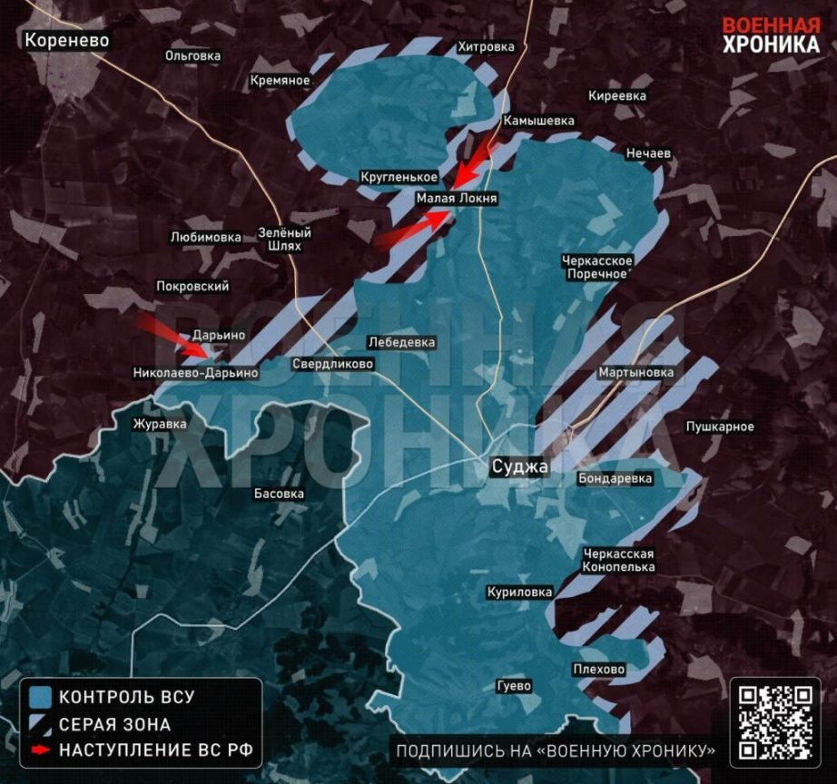 В Кореневском и Суджанском районах продолжаются бои в окрестностях Любимовки, а также Дарьино, где, по некоторым данным, украинские формирования предприняли несколько контратак. При этом некоторые ресурсы заявляют о том, что село была вновь утрачено российскими войсками, подтверждение чему, впрочем, нет.