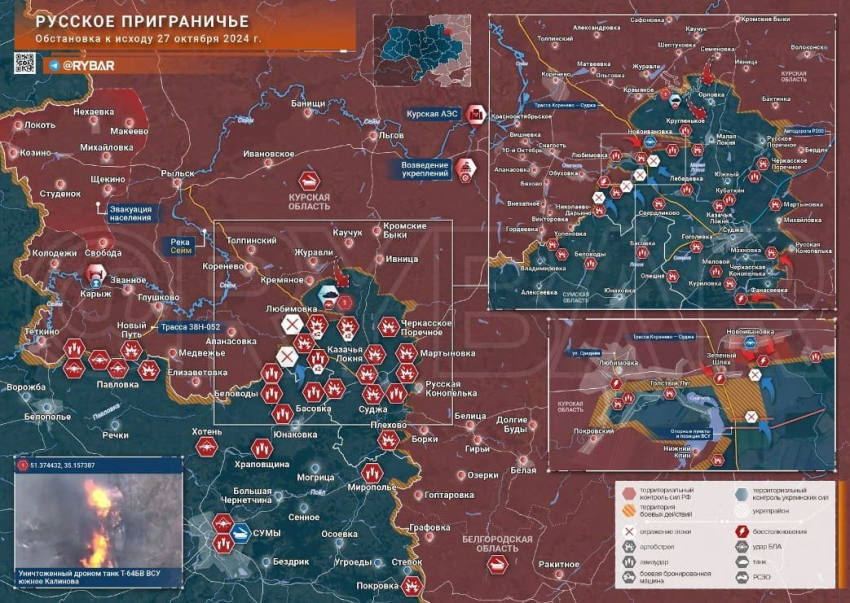По данным на 27 октября, в Курской области нанесены удары по бригадам ВСУ. Пресечены попытки националистов прорвать кольцо. Российские военнослужащие нанесли удары по дислокациям ВСУ.
