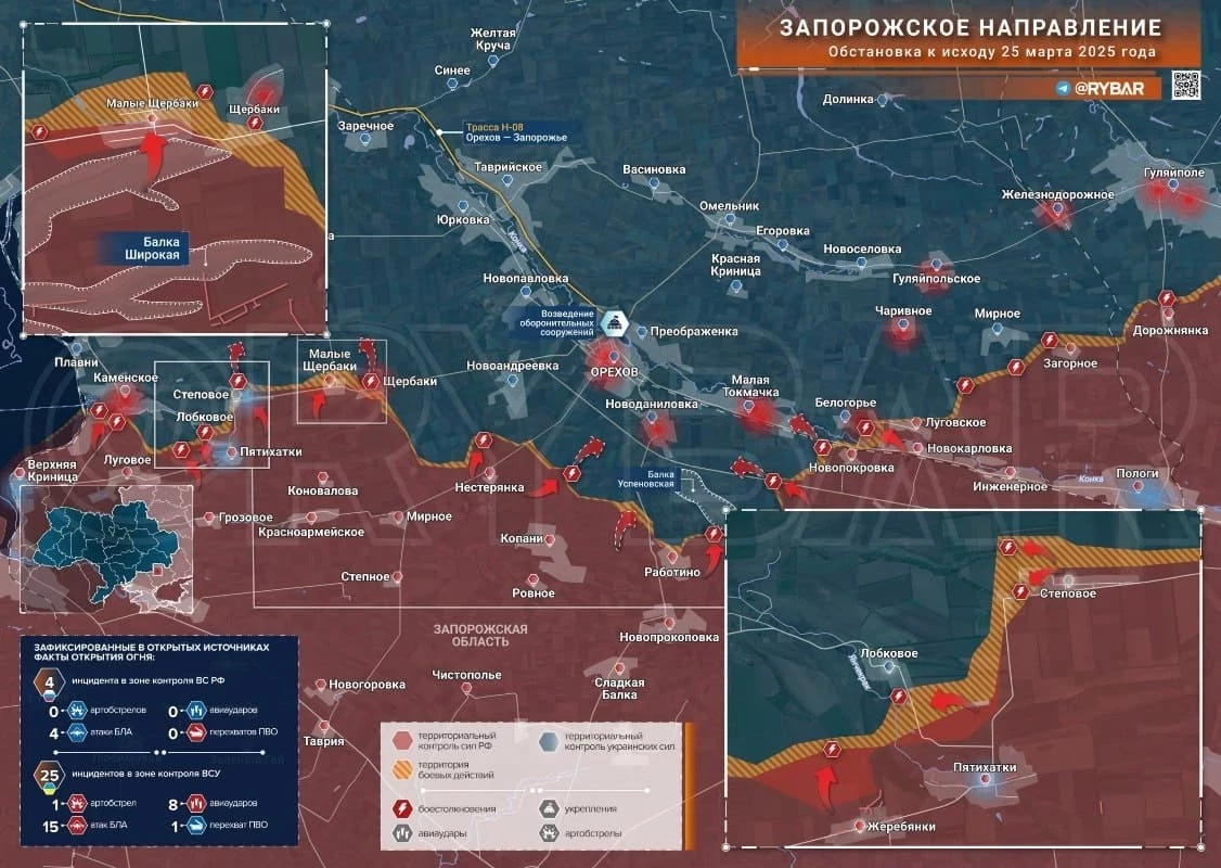 На Запорожском участке высокая огневая активность по линии Степовое - Щербаки. МО РФ официально подтвердило освобождение с. Малые Щербаки. Не стихают бои в районе Лобкового и Новоданиловки.