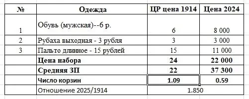 Сделаем расчеты, сравнив, сколько корзин нынешнего минимального набора продуктов (МПНП) можно было купить на среднюю зарплату в 1914 и 2025 годах.