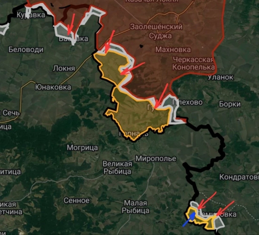 Прямо сейчас всушники пытаются организовать оборону на территории Горнальского Свято-Николаевского Белогорского мужского монастыря. Сейчас там пытаются закрепиться до трёх рот украинских военных. Населенный пункт Горналь и Сумскую область разделяет река Псёл, через которую ВСУ создали понтонный мост для ротации личного состава, а также снабжения боекомплектом и техникой НАТО. Сам монастырь оснащен подземным ходом, через который также активно проходит логистика противника.