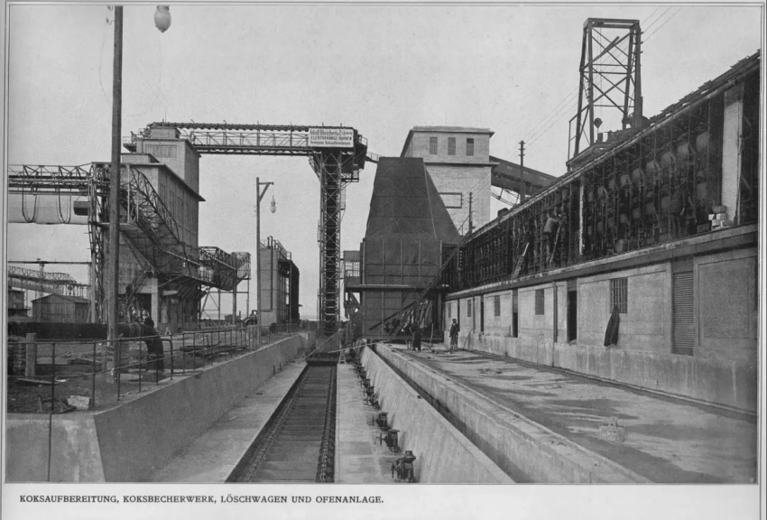 Хороших индустриальных фотографий мало, но есть отличный вид крупного коксового завода в Леопольдау, пригороде Вены, в 1911 году. В Руре были похожие коксовые заводы