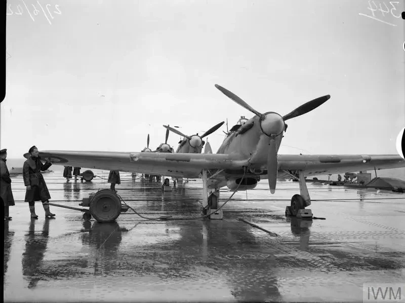 Да, кстати, такой еще нюанс: ускорители могли вытолкнуть с катапульты самолет максимальным весом около 3400 кг. Нормальный взлетный вес обычного «Харрикейна», без усилений, составлял около 3000 кг, так что о подвесных баках и прочих удовольствиях можно было не мечтать. Учитывая еще необходимость брать на борт спасательный набор – так себе перспектива.