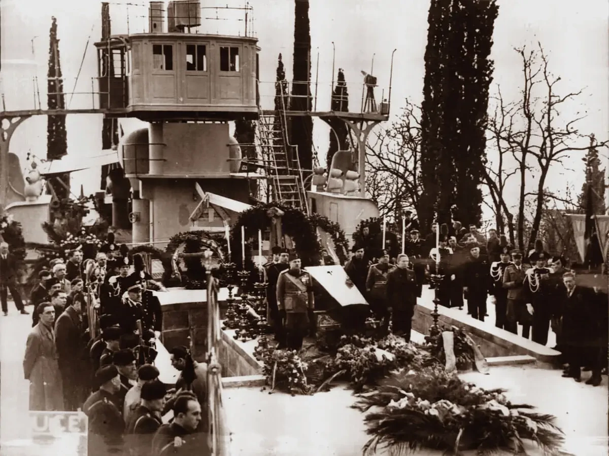Церемония прощания с Габриэле д’Аннунцио на палубе крейсера-музея, март 1938 года