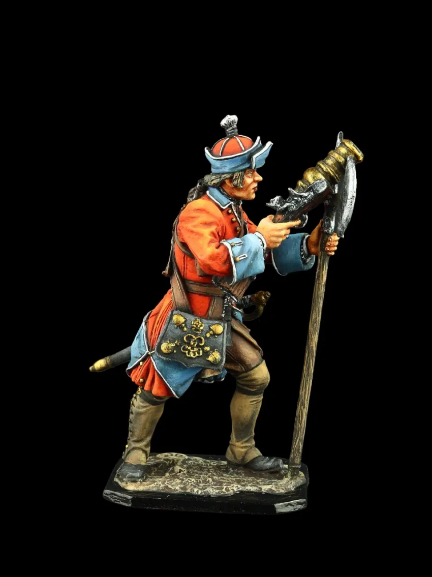 Бомбардир артиллерийского полка, Россия, 1708–1723 гг. Рисунок, с которого сделана эта фигурка, взят из книги «Историческое описание одежды и вооружения Российских войск с рисунками». Под редакцией Висковатова А. В. Вот только вряд ли он мог вот так стрелять чугунной гранатой, удерживая «мортирку» в руках. Уж очень сильной была бы ее отдача при выстреле. Опирать приклад надо было во что-нибудь твердое, например, о землю! Производители: «Silver Dream Studio» и «EK Castings».