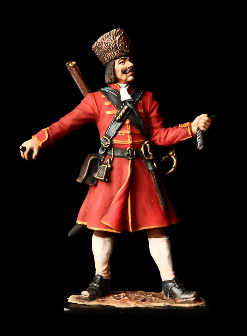 Гренадер 2-го Выборного (Бутырского) полка, 1698-1702 гг. Каждому гренадеру полагалось две двухфунтовые (ок. 800 г) чугунные фитильные гранаты в специальной сумке через плечо. В качестве головного убора гренадеры обычно носили высокие остроконечные колпаки, которые, в отличие от широкополых шляп и треуголок, не мешали ему забрасывать за спину на ремне мушкет, освобождая руки для метания гранат. Производители: «Silver Dream Studio» и «EK Castings».