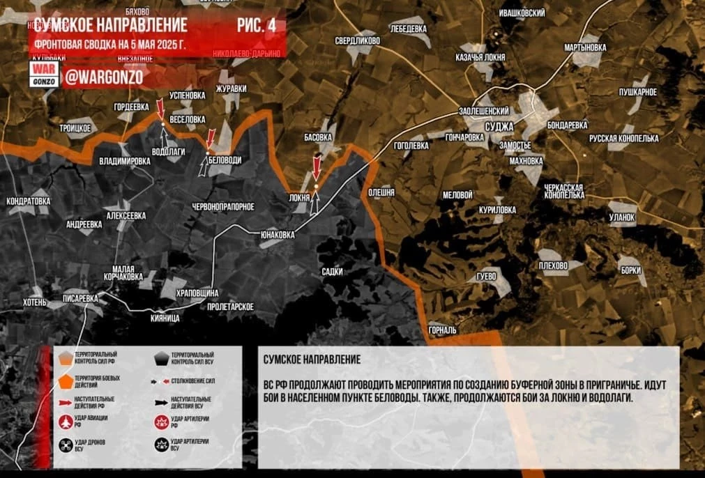 На Сумском направлении ВС РФ продолжают проводить мероприятия по созданию буферной зоны в приграничье. Идут бои в населенном пункте Беловоды. Также, продолжаются бои за Локню и Водолаги.