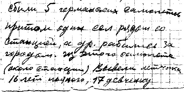 «Задерживается много шпионов и диверсантов на станциях». «Здесь один воинский эшелон привезли весь скошенный пулеметным огнем. Живых осталось очень мало, правда, я сам этого не видел». «Кончаю, т. к. опять начинают летать штуки, за которыми интересно наблюдать».