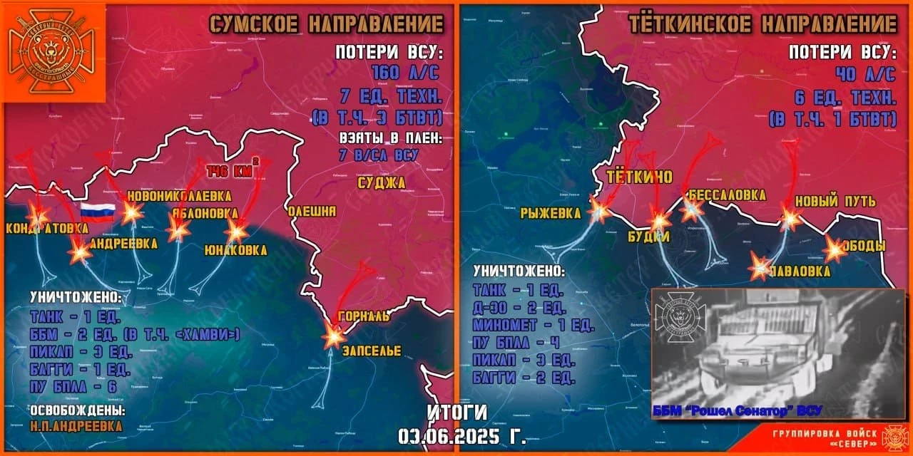 Накануне группировка войск "Север" уничтожала передовые и штурмовые подразделения противника на Тёткинском и Глушковском направлениях, продолжила создание полосы безопасности в Сумской области.