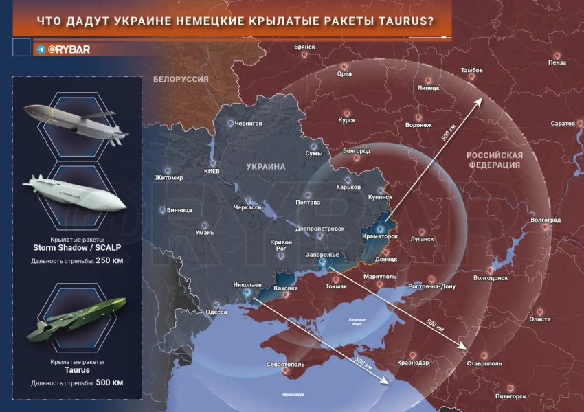 Зоны досягаемости различного украинского высокоточного оружия большой дальности. Изображение ТГ-канал «Рыбарь»