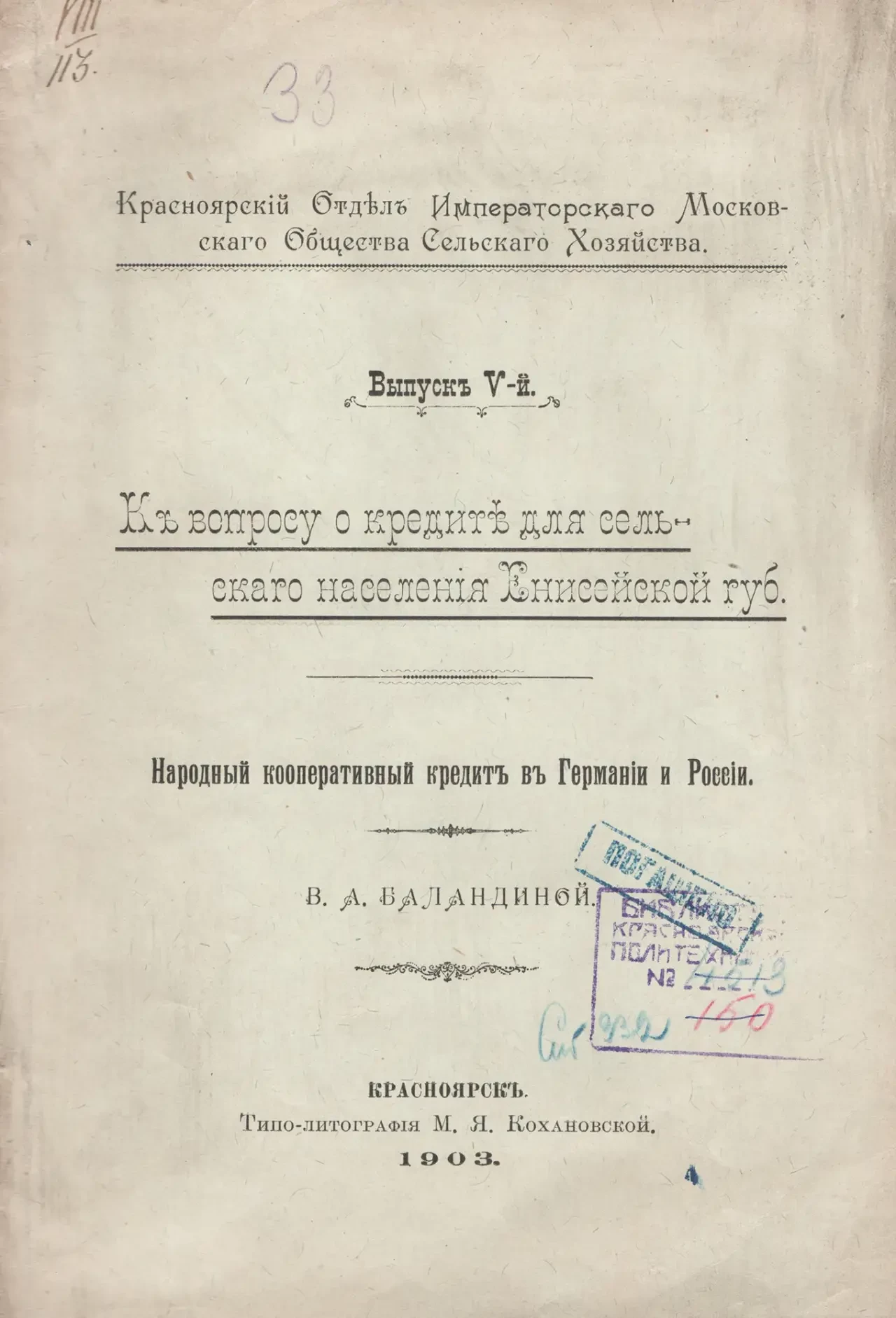 Брошюра. Баландина В.А. К вопросу о кредите для сельского населения Енисейской губернии. КККМ ОФ 10074/228