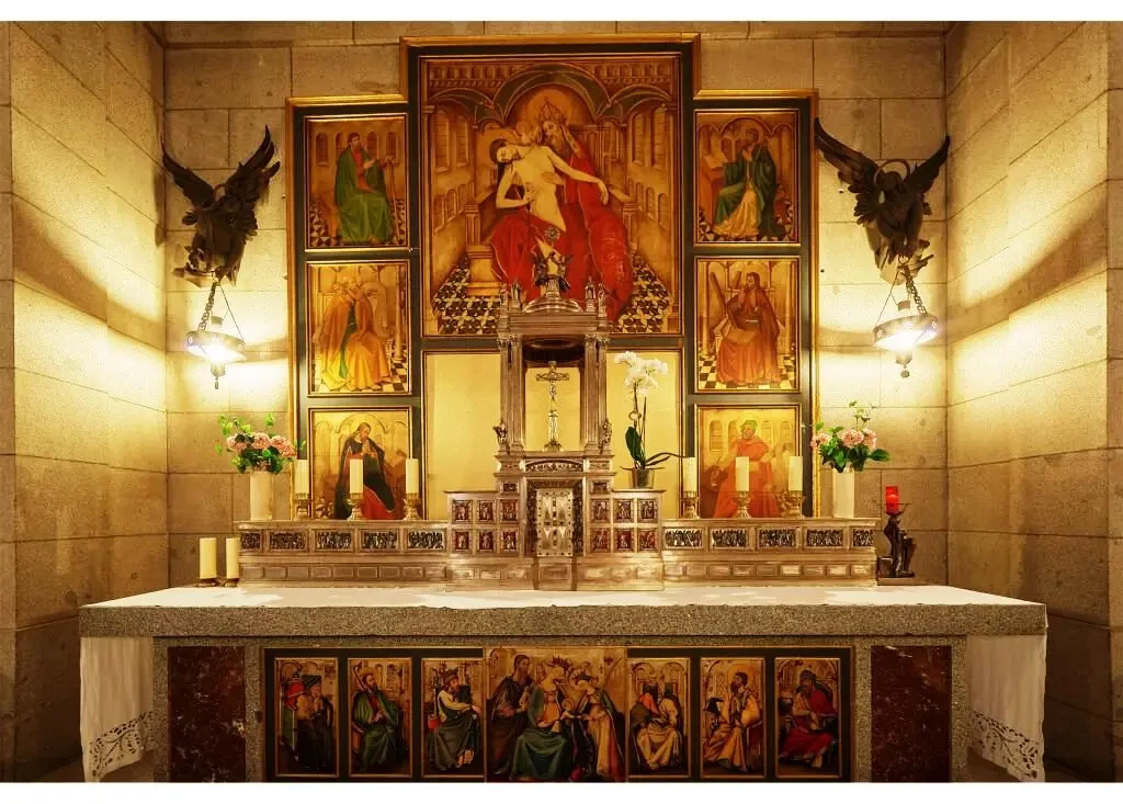 Длинный проход с боковыми капеллами и стенами, украшенными гобеленами и фресками с изображениями святых — покровительниц Армии, Флота, ВВС и Гражданской Гвардии, ведет к главному алтарю, у подножия которого ранее находились могилы Франсиско Франко и Хосе Антонио Примо де Риверы. Прямо перед входом в главное церковное пространство две огромные статуи ангелов с мечами охраняют вход, как ангелы Рая.