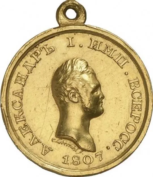 Аверс золотой медали, диаметром 28 мм. На аверсе медали был портрет Александра I, с лицом, обращенным вправо. По окружности вдоль края имелась надпись: «АЛЕКСАНДРЪ I ИМП. ВСЕРОСС. 1807». Под портретом располагалась витиеватая подпись автора-медальера – «C. Leberecht f.». Петерс Д. И. Наградные медали Российской империи XIX–XX веков. Каталог. М.: Археографический центр, 1996. С. 45-46.