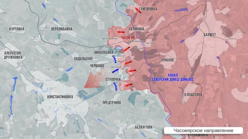 На западном фланге Торецкого направления тяжелые бои продолжаются в Яблоновке и в районе Александро-Калиново. В Щербиновке идут встречные бои. По Клебан-Быку и Катериновке ВС РФ наносят удары артиллерией и дронами. Продолжается штурм на восточной окраине Белой Горы. Власти Константиновки и Дружковки призвали жителей эвакуироваться из-за близости ВС РФ. Западные аналитики констатируют появление 15-км котла вокруг Константиновки.