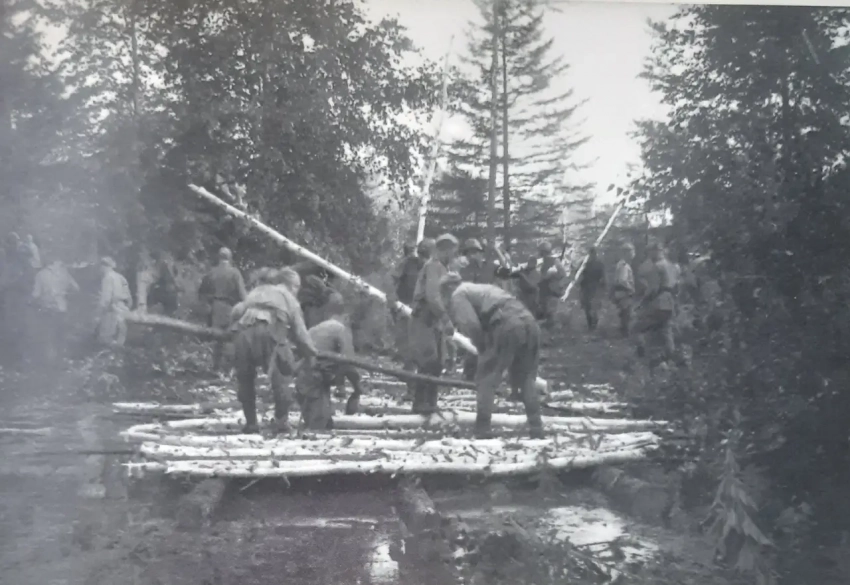 Шел дождь, дороги раскисли и были разбиты танками. Чтобы пройти от моста на р. Черная до Хандасы, 7,2 км, 1-й батальон 157-го полка рубил саперными лопатками деревья и укладывал почти сплошную гать для автомобилей и повозок.