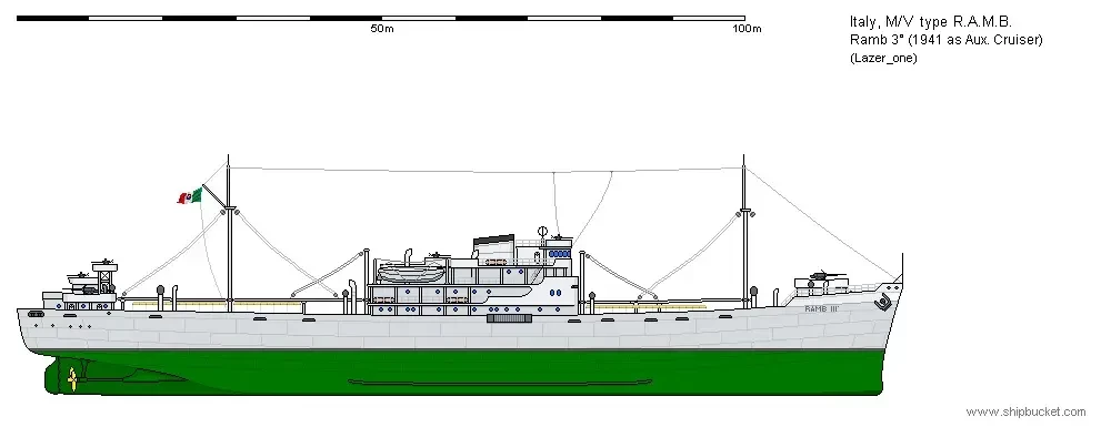 Долгая и полная событий жизнь досталась на долю «Ramb III». После начала военных действий он был реквизирован ВМФ и стал вспомогательным крейсером, эскортируя конвои на Средиземном море. Кроме того, судно использовалось и по своему первоначальному назначению, перевозя продовольствие для итальянских войск из Италии в Ливию.