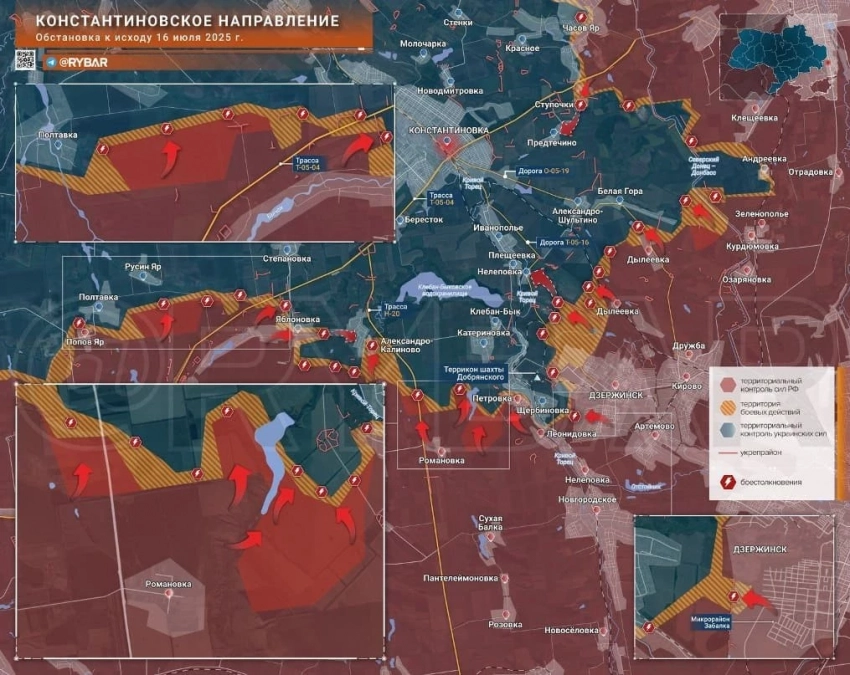 На Константиновском направлении из освобожденной вчера Петровки ВС РФ нацелены на Щербиновку. Одновременно наши давят на Яблоновку и Александро-Калиново. Вполне вероятно усиление российского напора на правом фланге: Дылеевка – Белая Гора – Александро-Шультино, что заставит ВСУ выводить свои части в район Бересток – Иванополье. А это развяжет Клебанбыкский узел обороны ВСУ, на который опирается оборона ВСУ в районе Торецка. В последние дни наши продвинулись западнее Дылеевки в посадках, взяв под контроль ряд опорных пунктов на высотах в направлении Александро-Шультино и Белой Горы. На севере участка, в Часов Яре, наши заняли территорию маслоэкстракционного завода.