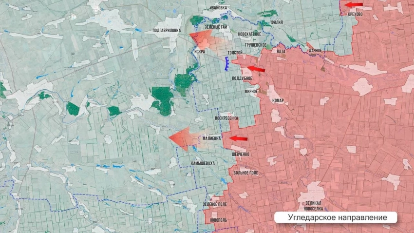 На юге Угледарского направления ВС РФ вклиниваются в оборону ВСУ, продвигаясь на запад от освобождённых сёл. Так, от Новополья наши выдавили ВСУ в направлении юго-восточной окраины Темировки, продвинувшись более чем на 1 км. От Вольного Поля приблизились еще на 2,5 км к Камышевахе, от Поддубного – на 1 км к Александрограду и на 2 км – по дороге к Искре. По данным Минобороны, освобождено Новохатское. Это ещё один путь к границе ДНР с Днепропетровской областью.