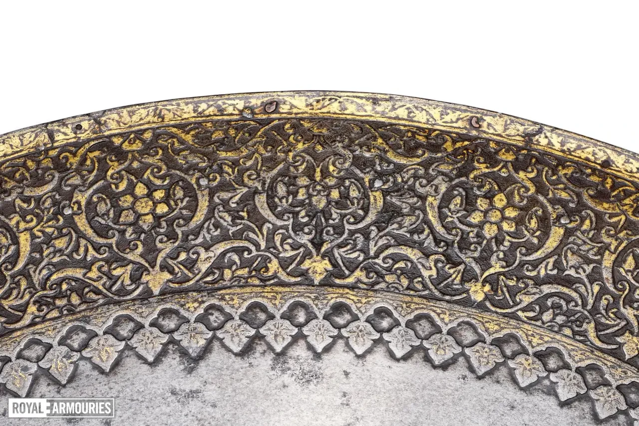 А вот Восток («дело тонкое») с боевым применением щитов подзадержался. Вот, например, щит «дхал» конца XVIII — начала XIX в. Изготовлен в Лахоре, Пенджаб, Индия. Щит стальной, круглый, слегка выпуклый. Широкая кайма и центральная часть украшены низким рельефом с арабесками и цветами, позолоченными на тёмном фоне. Четыре невысоких умбона и полумесяц служат заклёпками для внутренних колец, удерживающих рукояти. Их основания представляют собой изящные металлические медальоны с ажурной резьбой. Внутренняя поверхность, накладка и две рукояти обтянуты коричневым бархатом, возможно, первоначально пурпурного цвета. Большая часть внутренней поверхности покрыта вышитыми золотыми нитями узорами, включая восемь высоких цветочных побегов, тянущихся от края к центру, и звезду на подушечке за петлями для рукояти. Вес щита 3,52 кг. Диаметр 58 см.