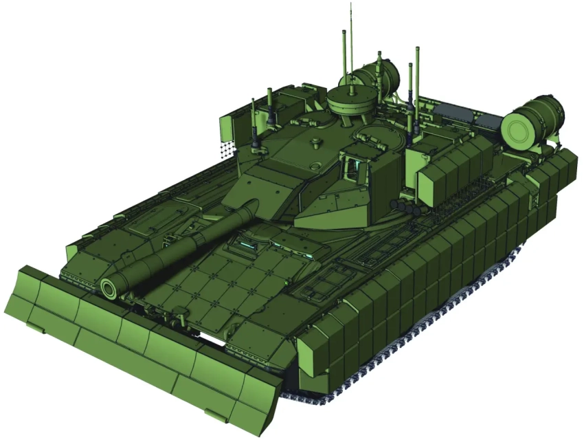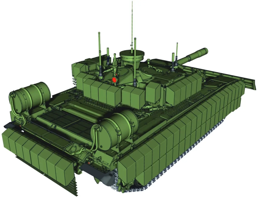Как штурмовая машина, он должен обладать куда большей, чем у обычного танка, защищённостью от поражающих средств, в особенности от ручных гранатомётов и ПТРК. И, судя по опубликованным в прошлом изображениям, в нём это может быть реализовано за счёт кругового «обвеса» динамической защиты. Причём всё сделано грамотно: по бортам и в корме у него «ящики» с ЭДЗ, установленными под углом, а во лбу — блочная ДЗ с мощной защитой башни. То есть с лёгкостью уничтожить его противотанковой ракетой или выстрелив из РПГ откуда-нибудь из-за угла или окопа не получится.