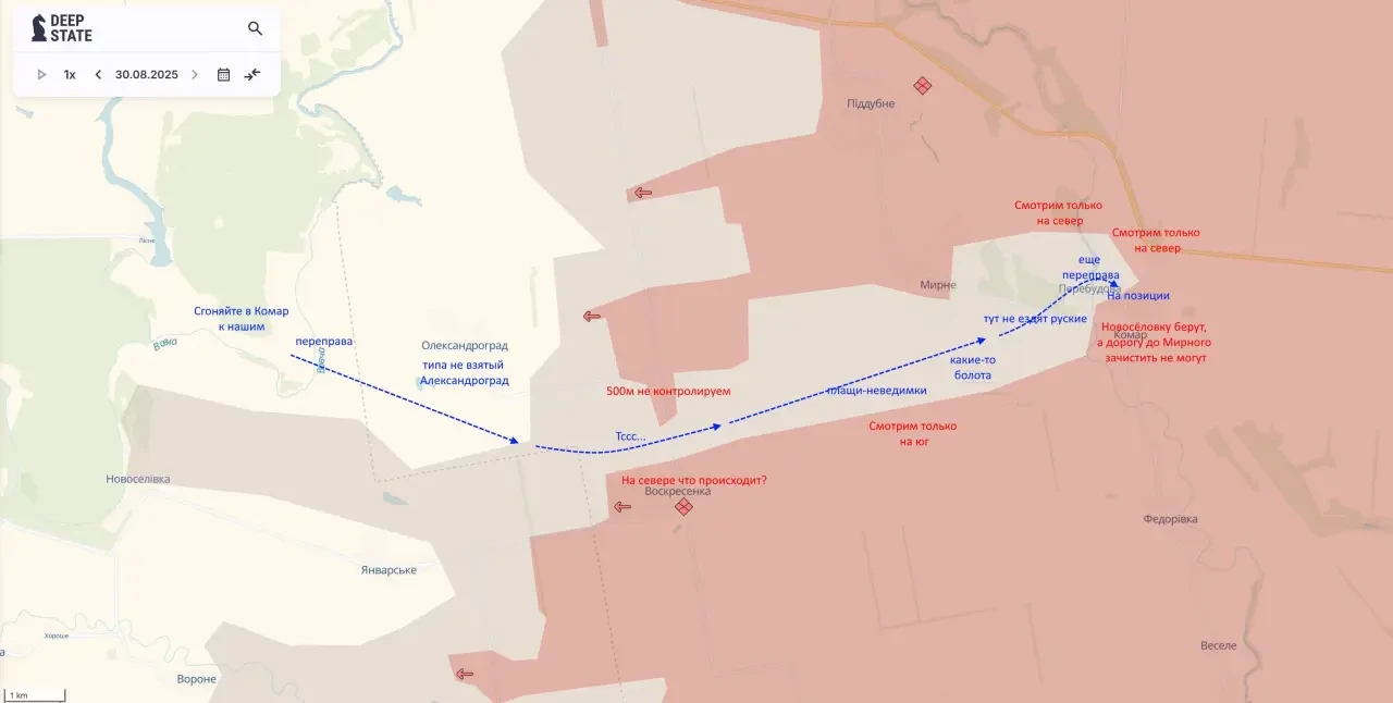 Так, по версии крупнейшего украинского военного паблика, украинские формирования не только якобы все еще удерживают населенный пункт Перестройка, но и ведут активные бои за Комар. При этом снабжение украинских «киборгов», по версии ресурса противника, якобы осуществляется по длинному коридору, ширина «горловины» которого не превышает 500 метров и путь через которую проходит в непосредственной близости от северных окраин Воскресенки. Более того, мифический путь якобы проходит через болота и реки под постоянным огневым воздействием ВС РФ.