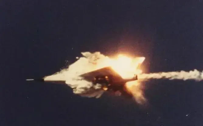 Воздушная мишень QF-100D после попадания в неё ракеты AIM-9 Sidewinder с инертной боевой частью