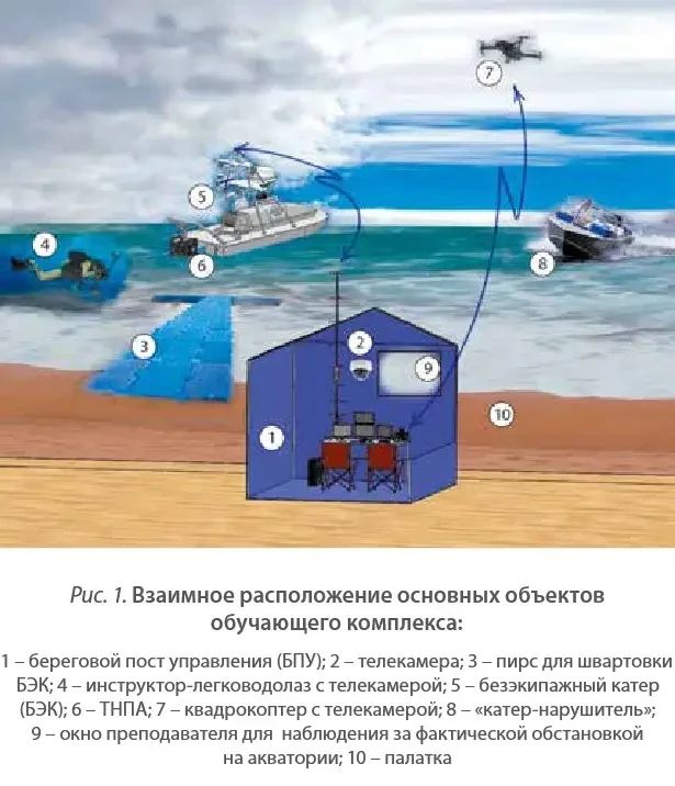 Например, предлагаются комплексные упражнения по поиску и задержанию условного нарушителя. В роли последнего выступает катер или моторная лодка с экипажем. В этом случае курсанты должны вести наблюдение за акваторией при помощи БПЛА, засекать «нарушителя», а затем направлять к нему БЭК. В зависимости от сложности занятия, возможна погоня с маневрированием. Телеуправляемый подводный аппарат позволяет проводить занятия по исследованию толщи воды или дна, а также по противодиверсионной борьбе.