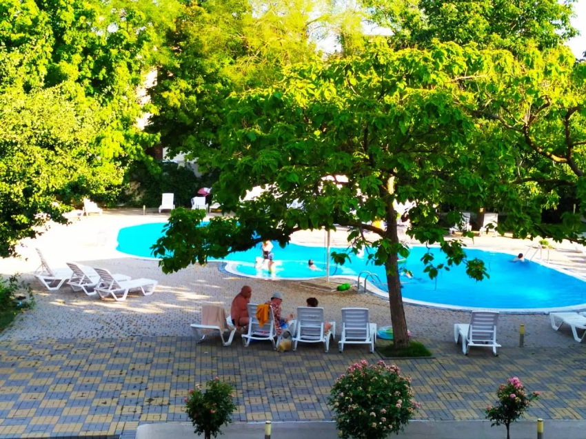 Коротко о месте моего отдыха. Чтобы это не выглядело рекламой, я название не напишу, но кто захочет, найдет, у этого отеля бассейн очень характерной формы. Отель в самом центре Анапы, ну «центрее» не бывает. Номера стандартные, как и в большинстве отелей побережья. Чистота, уют, тишина, порядок во всем. Конечно, надо принять во внимание, что отель не был заполнен полностью в связи с разливом мазута, но нам это было только на руку. Во дворе отеля хороший подогреваемый бассейн среди зеленой зоны, вокруг бассейна шезлонги, рядом бар с различными напитками.