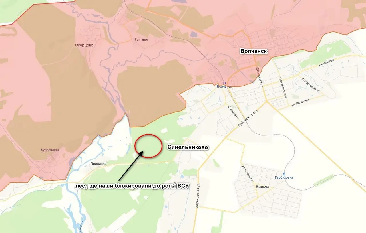 Штурмовые группы «Северян» продолжают продвижение в лесном массиве к западу от Синельниково, а также успешно отражают попытки противника деблокировать подразделения из состава 57-й отдельной мотопехотной и 127-й отдельной тяжелой механизированной бригад ВСУ, которых наши зажали в этом лесу. За прошедшие сутки противник дважды пытался пробиться к окруженным, но потерпел фиаско и отступил.