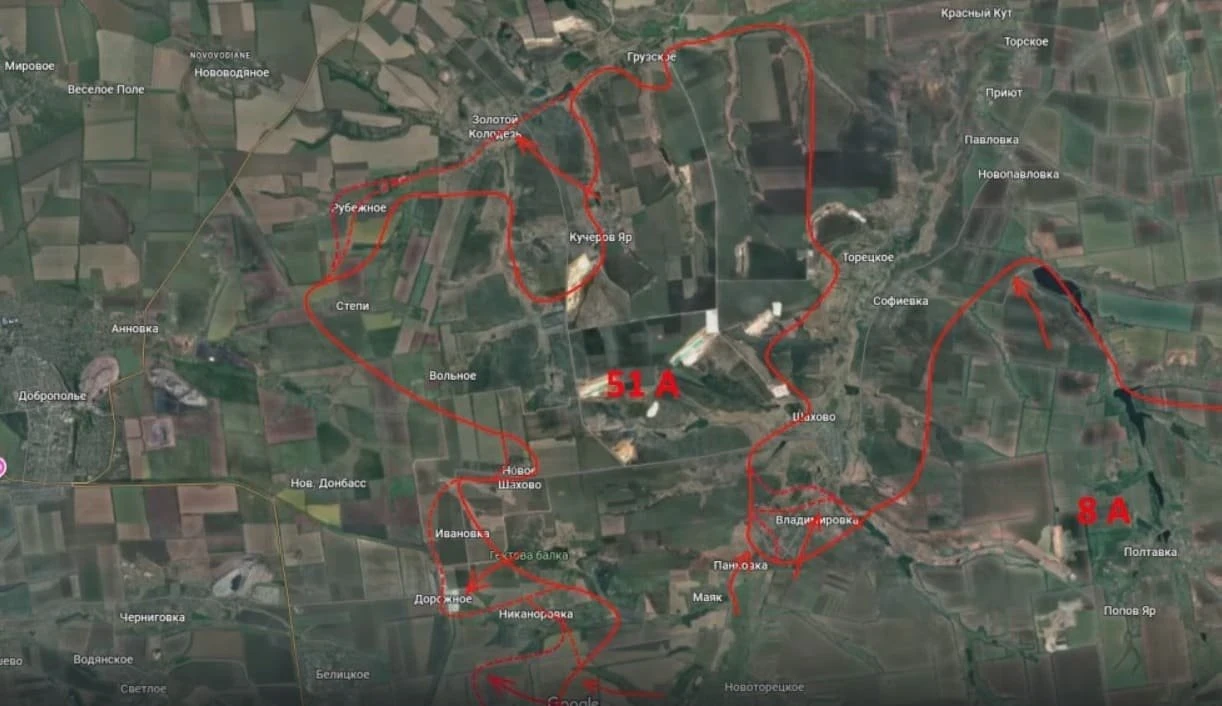 Таким образом, об угрозе отрезания частей 51-й армии речь больше не идет. Более того, российские войска сами перешли в атаку вглубь выступа, продвигаясь в районе Новошахово (вероятно, имелся в виду населенный пункт Шахово). Бои идут в Рубежном и на окраинах Золотого Колодца. Противник пока удерживает линию обороны "Золотой Колодец - Русское". Дальнейшее наступление на этом участке станет возможным после окончательного срезания выступа в районе Шахово и Софиевки.
