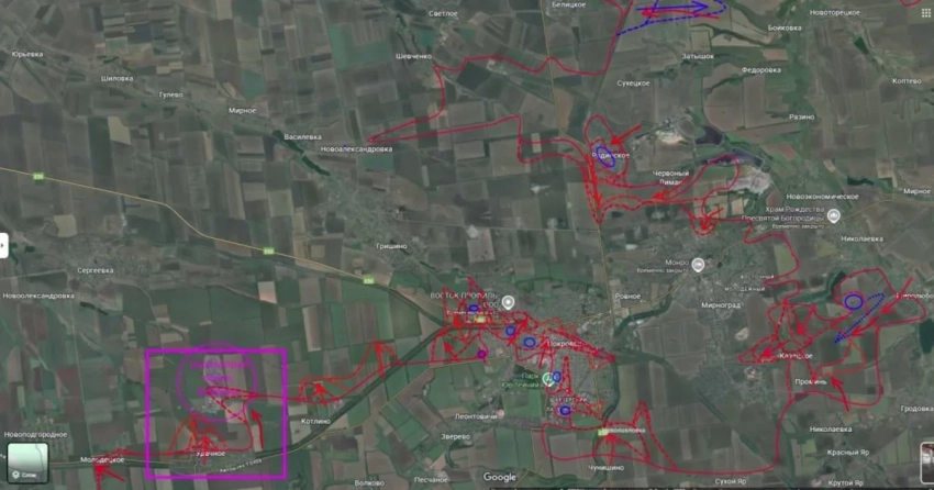 К северу от города, в районе шахтоуправления «Покровское» и обогатительной фабрики, группировка ВСУ, по сути, зажата в клещи. Российские подразделения заняли не только восточные и северные здания этого крупного промышленного комплекса, но и вышли на его западные окраины. Таким образом, снабжение этого укрепрайона с "большой землей" практически прервано.