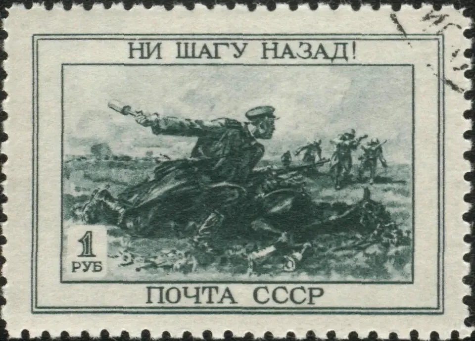 Ни шагу назад! Почтовая марка СССР выпуска апреля 1945 года. Рис. Г. Савицкого.