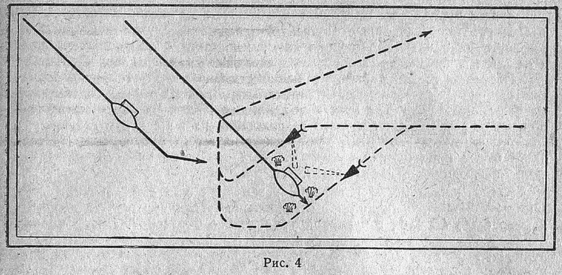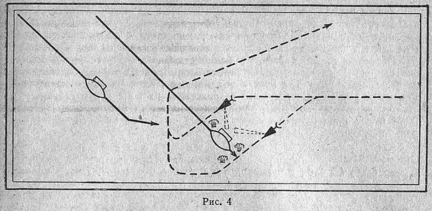 Однажды ночью 2 наших шхуны при выходе из шхер были обнаружены самолетом противника. Около полудня головная шхуна слева на курсовом угле 40 заметила 2 торпедных катера, которые быстро шли на сближение с ней (рис. 4).