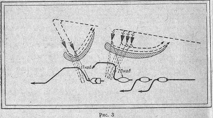 Кроме того, постановка дымовых завес производилась одновременно с двух торпедных катеров. Интересным является также изменение дистанций в строе кильватера. Переход совершался в строе кильватера на дистанциях, больше нормальных. При появлении же опасности строй смыкался (дистанция в этом случае меньше нормальной). Это, по всей вероятности, является узаконенным маневром во время перехода. Малые хода и глушители применялись, по-видимому, для уменьшения возможности обнаружения.