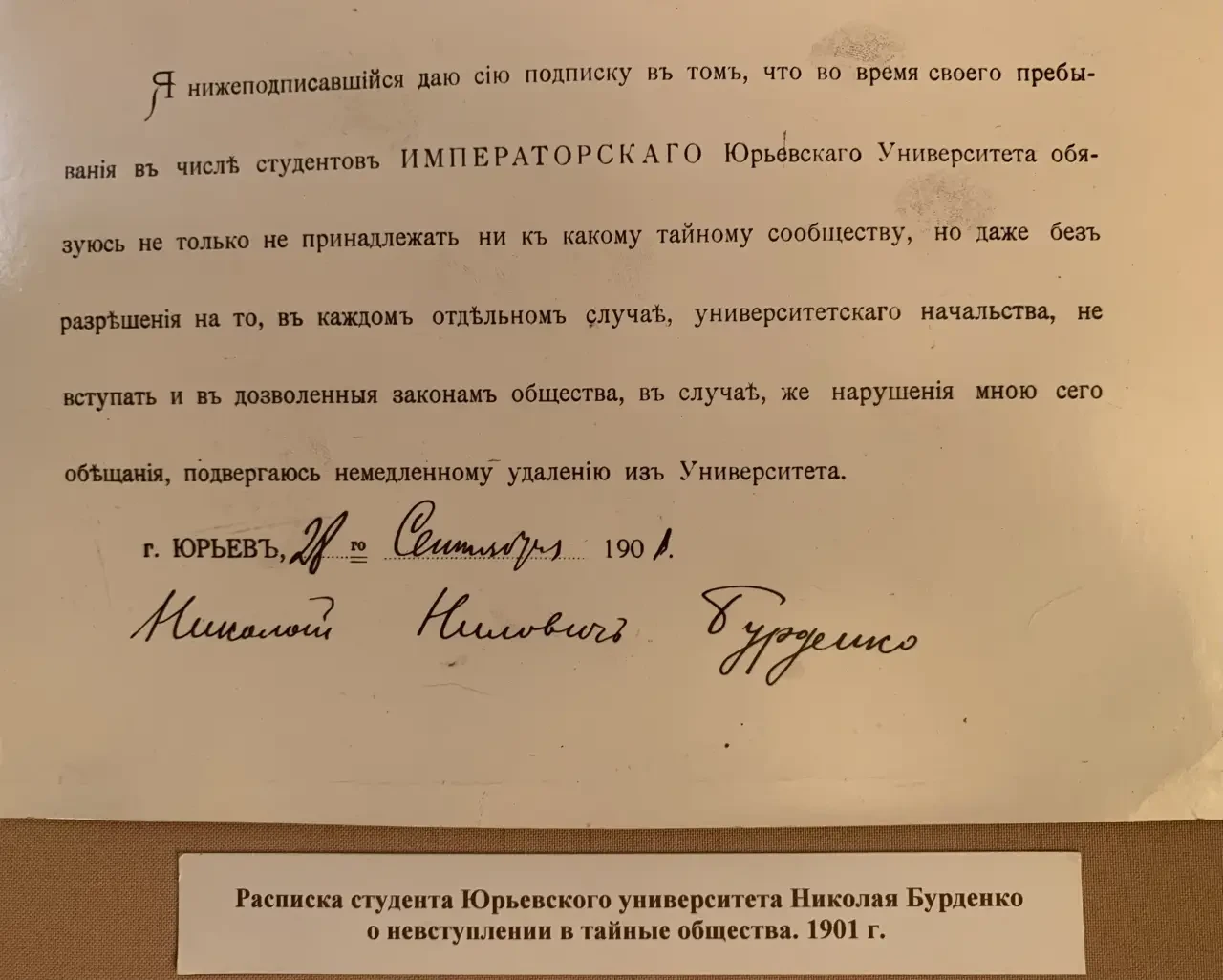А дальше было так, что хотя некую бумагу на фотографии Николай и подписал, но… участие в забастовке студентов в 1899 г. все-таки принял и был исключен из университета. Однако подал прошение о восстановлении и снова вернулся в университет. В 1901 году его имя снова появилось в списке забастовщиков, по некоторым сведениям, попало оно туда случайно. Однако Бурденко был все же вынужден покинуть Томск и 11 октября 1901 года перевестись… в Юрьевский университет (ныне университет в городе Тарту, Эстония) на четвёртый курс медицинского факультета. Там, видимо, было «посвободнее». Но отметим и тот факт, что не так уж и сильно царизм преследовал молодых бунтовщиков. Возможность учиться для них он не закрывал…