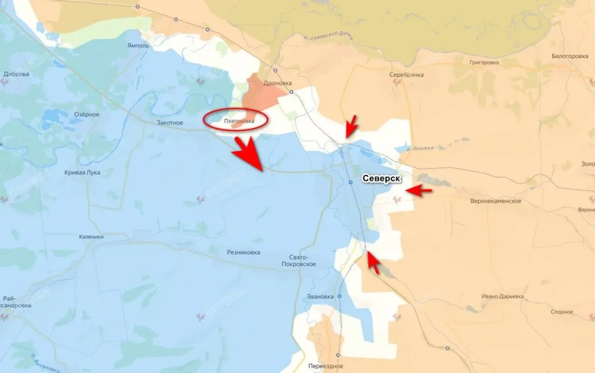 Как отмечают российские ресурсы, на данный момент в Северске сосредоточена довольно большая группировка противника, задачей которой является удержание города. Судя по сложившейся ситуации, наши не идут в лоб со стороны Верхнекаменского и Новоселовки, предпочитая зайти в тыл противнику. Платоновка — это как раз такой манёвр.