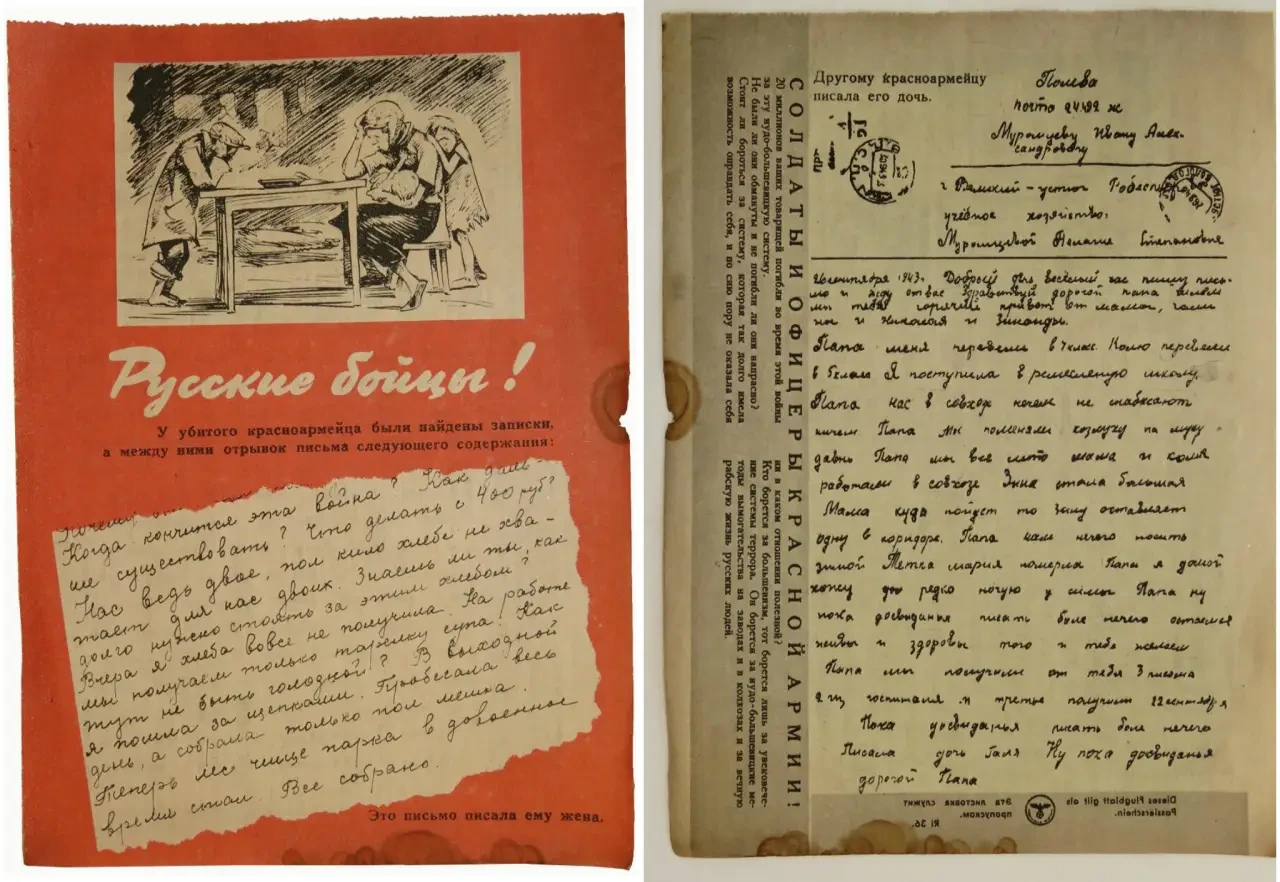 Листовка с факсимильным изображением писем от жены и дочери красноармейца. Письма, вероятно, были написаны пропагандистами вермахта