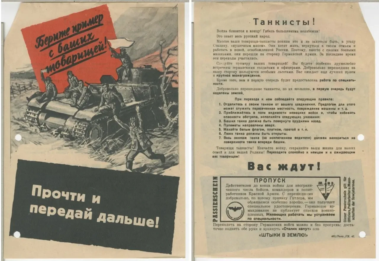 Были и более изобретательные средства, например, распространялись книжечки с названием «Не только тебе, но и твоим товарищам» со множеством отрывных пропусков и карикатур. Также нужно упомянуть о листовках, в которых объявлялось о том, что в рядах Красной Армии много врагов Сталина и солдат, сотрудничающих с немецкой армией. В них давалась рекомендация вступить в коммунистическую партию, «быть образцовым коммунистом», чтобы отвести от себя подозрения командиров в нелояльности советской власти, чтобы таким образом легче перейти к немцам.
