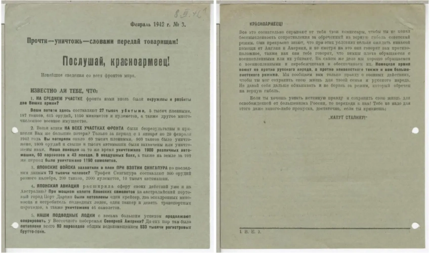 В данной статье пойдёт речь о дополнительных информационных нарративах в немецкой листовой агитации. Также будет дано продолжение классификации нацистских листовок, обращенных к бойцам Красной Армии, начатой в предыдущих двух статьях.