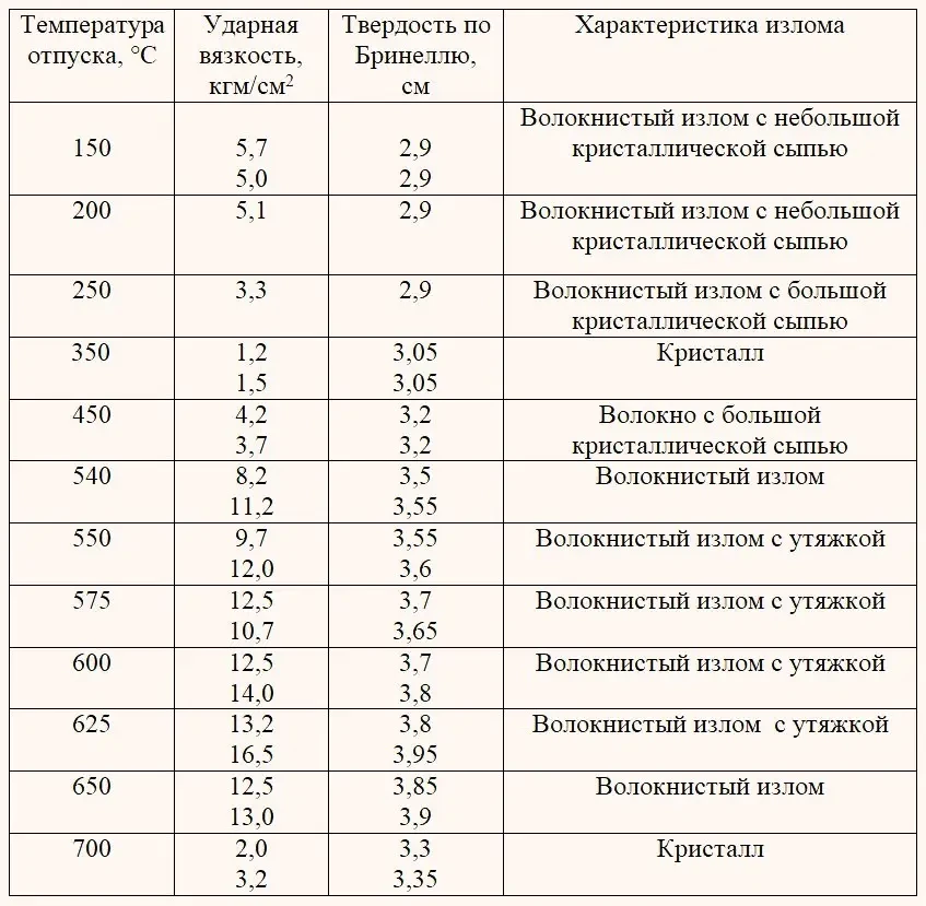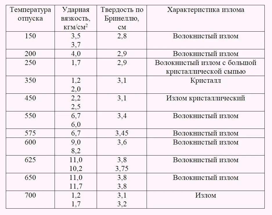 Данные таблицы показывают, что, начиная с температуры 250°C до 500°C, наблюдается резкое понижение ударной вязкости, доходящее до 1,2–1,5 кгм/см2 при температуре отпуска 350°C.