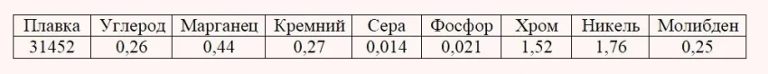 Углерод — 0,25%; кремний — 0,26%; марганец — 0,50%; сера — 0,020%; фосфор — 0,024%; хром — 1,54%; никель — 1,83%; молибден — 0,26%.