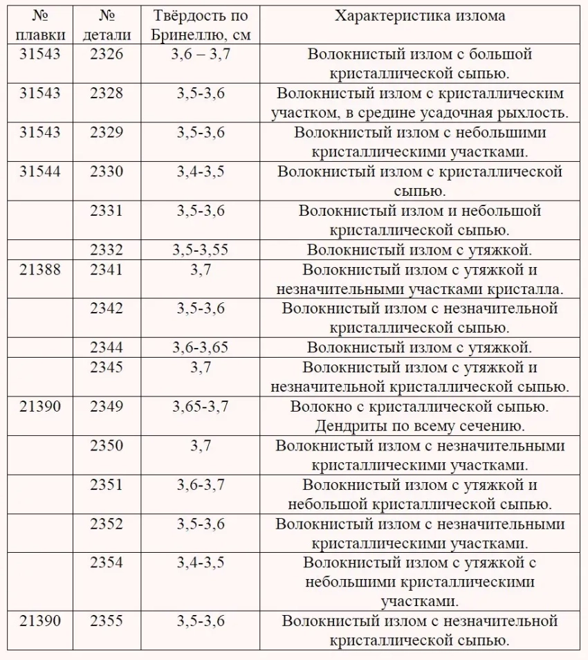Характеристика излома твёрдости деталей плавок 31543, 31544, 21388, 21390