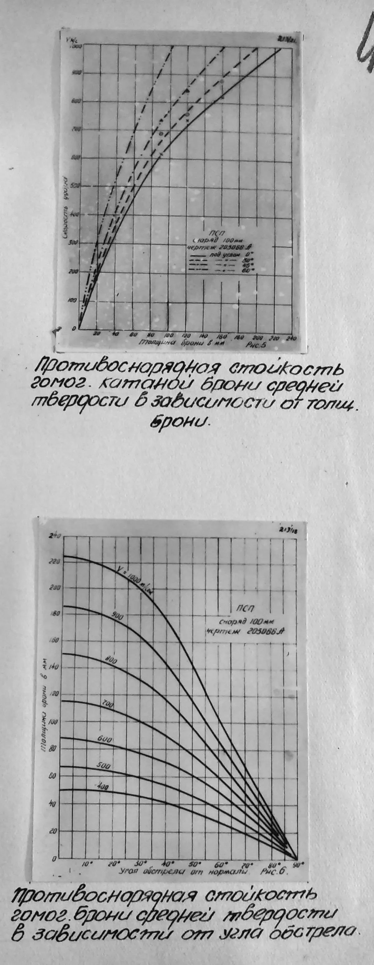 Расчет противоснарядной стойкости в одном случае производился на основании перерасчета коэффициента «К», рассчитанного по бортовой формуле Жакоб-де-Марра для немецкого снаряда 105-мм калибра, на снаряд 128-мм, а в другом случае, на основании сопоставления кривых стойкости отечественной и немецкой брони под огнем одних и тех же немецких снарядов и установленной общей закономерности в характере кривых, кривая стойкости немецкой брони против бронебойных снарядов 128-мм калибра была скорректирована для отечественной брони. Следует отметить, что полученные расчетные значения противоснарядной стойкости по пределу сквозного пробития при сопоставлении в обоих случаях показали достаточно хорошее совладение.