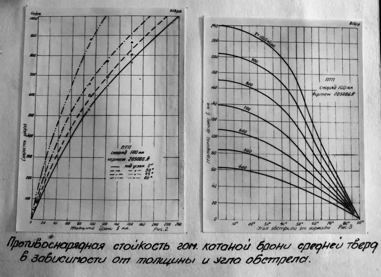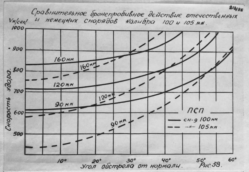 Из представленной диаграммы видна высокая пробивная эффективность немецких бронебойных снарядов калибра 105 мм по сравнению с отечественными тупоголовыми бронебойными снарядами калибра 100 мм, особенно при относительно небольших углах обстрела. При больших углах обстрела наблюдается обратная зависимость, пробивная эффективность немецких снарядов ниже отечественных.