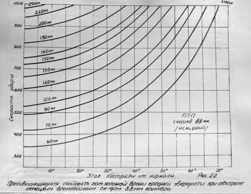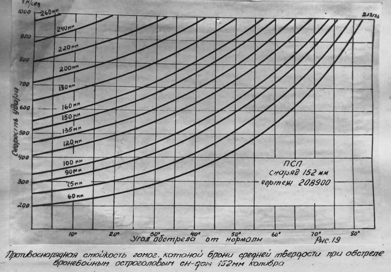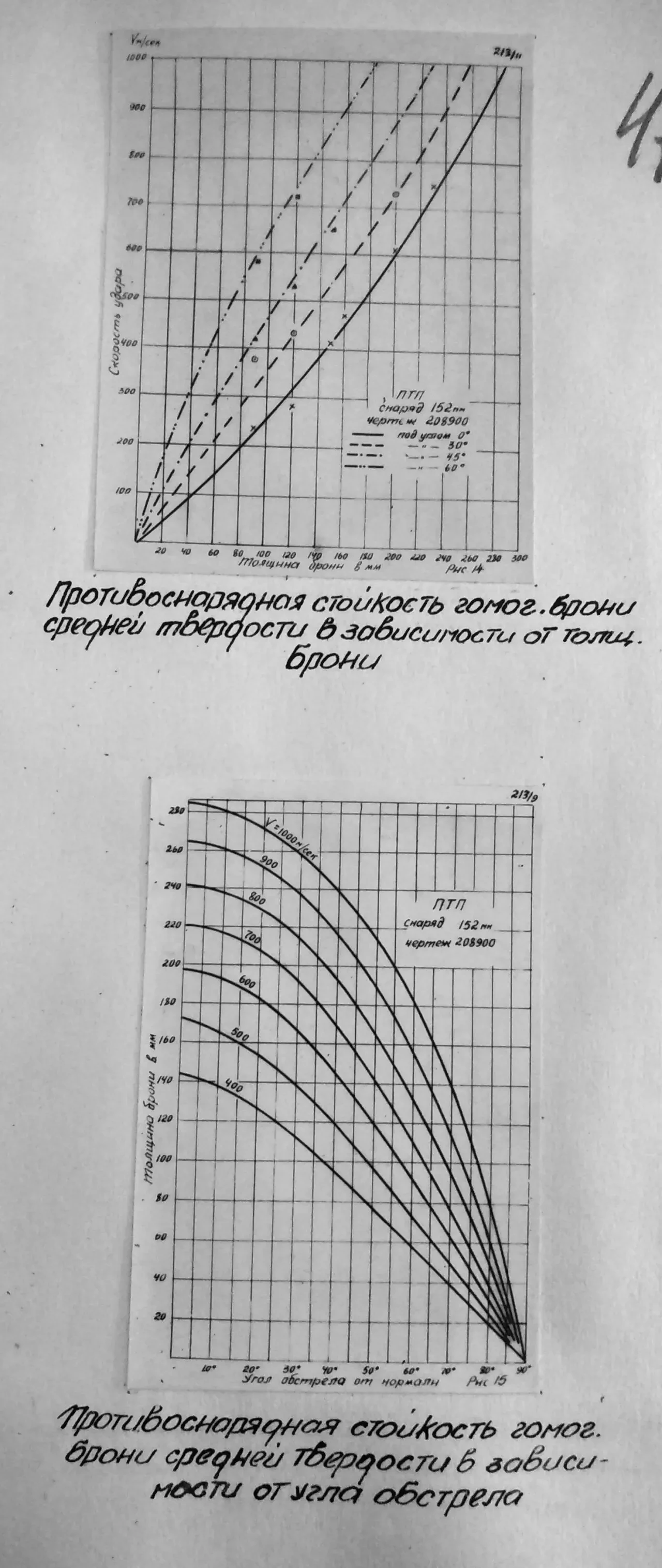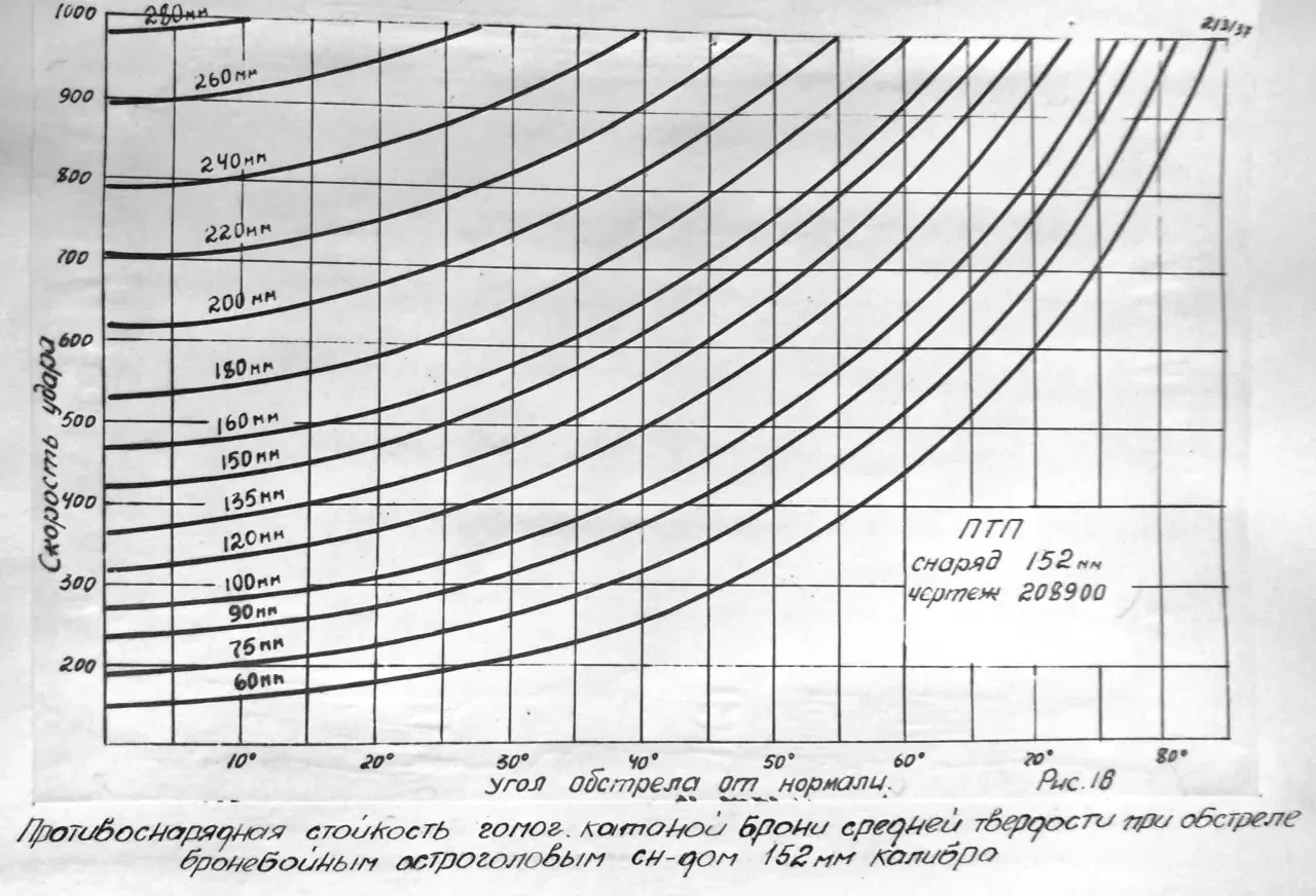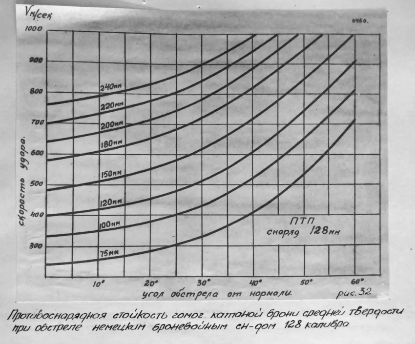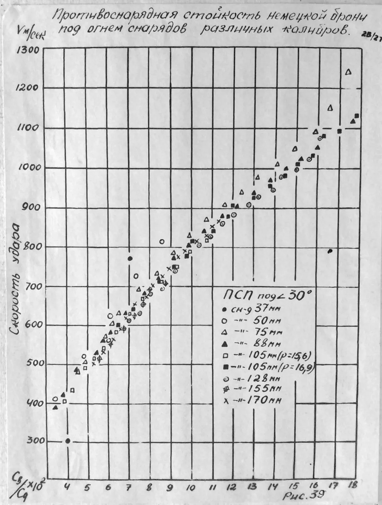 Однако, используя трофейные материалы Хиллерслебенского полигона, подробно о которых будет сказано ниже, данные Кубинского полигона по испытанию опытного объекта «260» немецкими 128-мм снарядами и имеющиеся данные по обстрелу отечественной брони немецкими снарядами меньших калибров, расчетным путем были получены тактические диаграммы противоснарядной стойкости отечественной гомогенной брони также против снарядов и этого калибра.