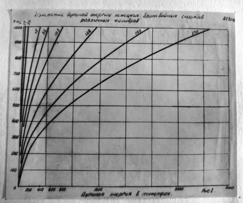 1) Бронепробивное действие немецких и отечественных снарядов крупного калибра (88–152 мм) по гомогенной броне средней твёрдости весьма эффективно лишь при обстреле по нормали или при небольших углах встречи от нее. При этих условиях испытания бронебойные снаряды при скоростях встречи с броней около 1000 м/сек. способны пробить броню толщиной в два с лишним раза превышающей калибр снаряда.