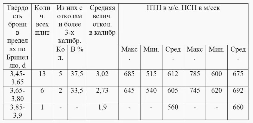Кроме плит средней твердости, использованных для снятия тактических характеристик, были также испытаны гомогенные плиты той же плавки и технологии, обработанные на твердость 3,7–3,9 d.
