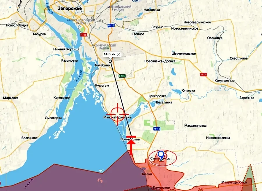 Согласно последним данным, российские десантники продвинулись на западной окраине Степногорска и в жилой застройке поселка. В Приморском наши штурмовики постепенно продвигаются на север, сообщается, что бои идут в центре села. Далее вдоль Днепра наносятся удары по Малокатериновке. От Приморского до южных окраин города Запорожье по прямой около 15 километров.