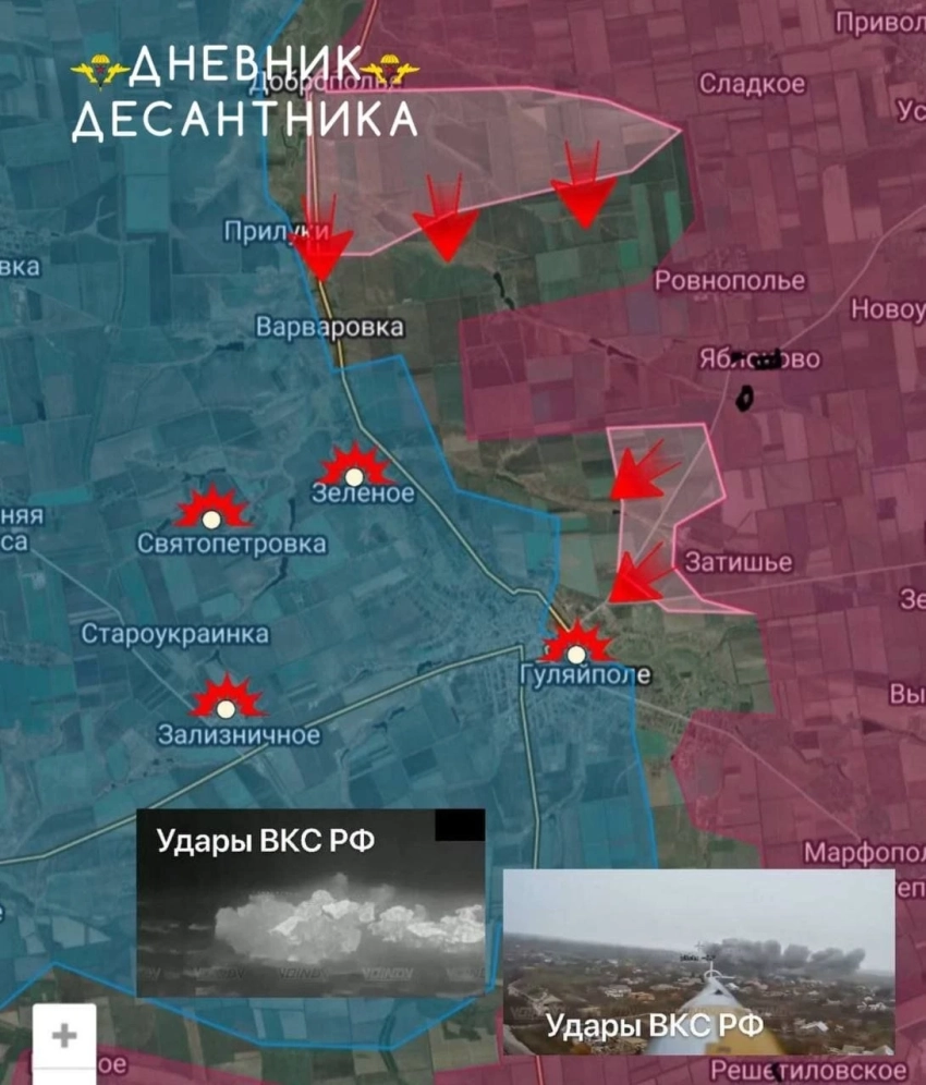 Военкоры добавили, что со стороны Затишья армия РФ продвигается к северо-восточной окраине Гуляйполя, в ходе успешных атак они вышли к Донецкой улице, территории до реки Гайчур в серой зоне.