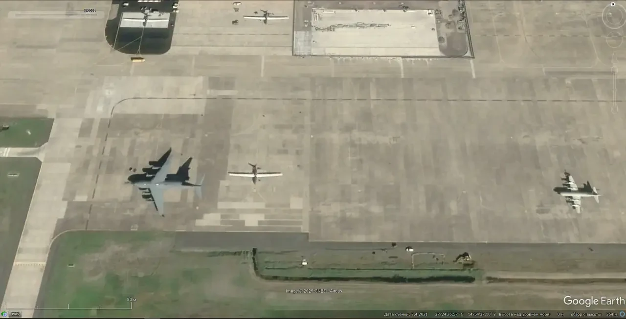 Спутниковый снимок Google Earth: самолёты ДРЛО Boeing E-3G Sentry и тяжелый военно-транспортный самолёт Lockheed C-5М Galaxy на авиабазе Элмендорф-Ричардсон